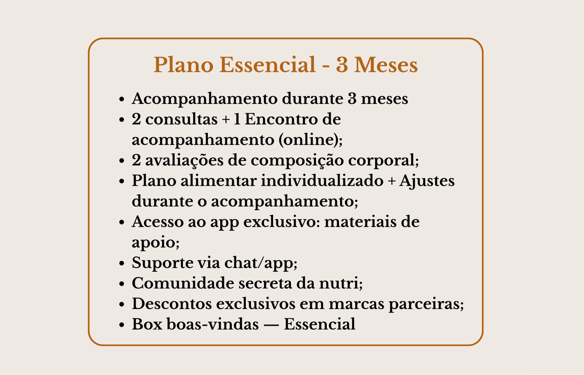 Meu trabalho é ensinar você a fazer escolhas conscientes, alinhadas aos seus objetivos e à sua realidade. Eu vou te acompanhar e mostrar que dá para ter uma vida melhor e se alimentar com equilíbrio. Sem ideias mirabolantes. Sem dietas da moda ou restritivas.